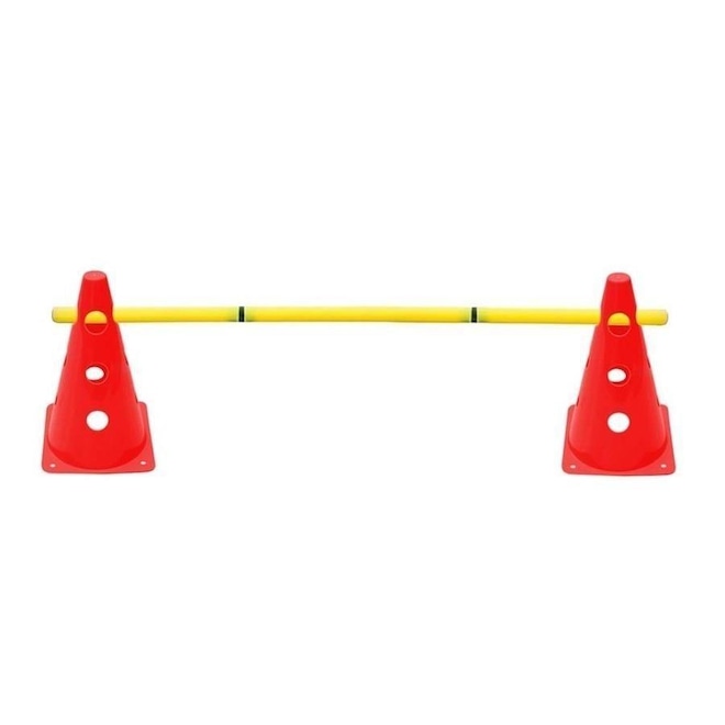 O kit Agilidade da Poker é composto por dois cones em Plástico Rígido perfurados com três opções e altura, o comprimento total do cone é de 23 cm e o diâmetro 13 cm, e um bastão em PVC com comprimento total de 90 cm.