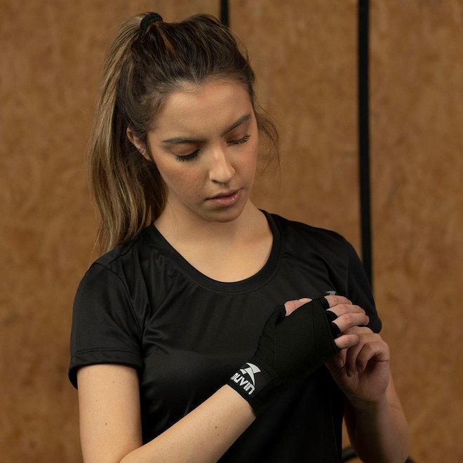 A Bandagem Elástica Muvin conta com costura reforçada, alça para o polegar e fechamento em de contato para facilitar o ajuste e garantir máxima proteção.