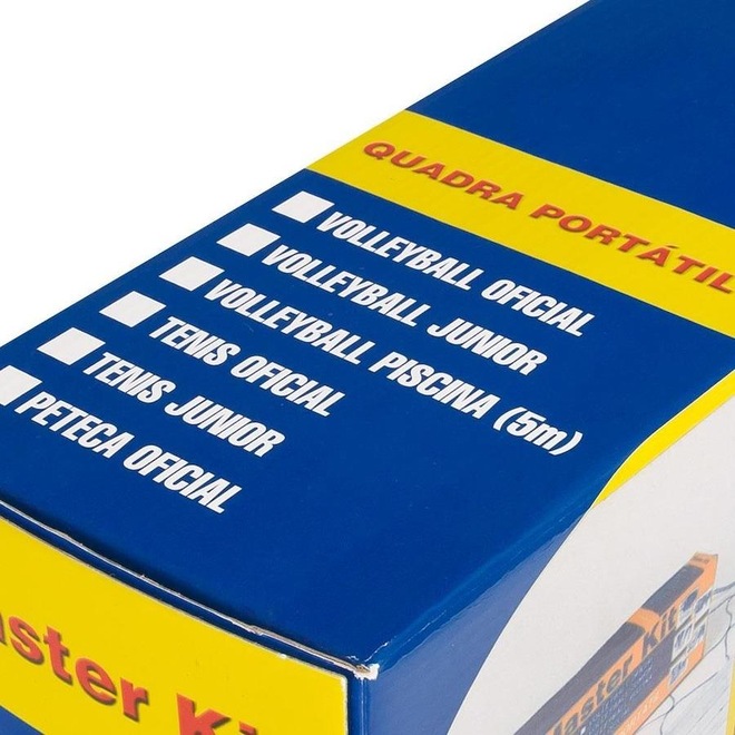 Conheça as Característcas do Kit Master de Beach Tennis Oficial - Perfil: Tênis de Praia - Material: Polietileno (rede) - Detalhamento: 01 rede preta com tratamento UV, 02 mastros de tubo de ferro redondo desmontáveis com pintura eletrostática, cordas de polietileno para marcação de quadra, ganchos galvanizados para fixação, cordas de polietileno para sustentação dos mastros, componentes plásticos e manual de instrução para montagem - Medidas: Mastros: 1.70m/ Cordas para Marcação: 08.00x16.00m/ Rede: 0.70x8.20m - Origem: Nacional.