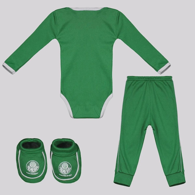Composição: 70% Algodão 30% Poliéster (ambas as peças) Ajuste body: Botões entrepernas Ajuste calça: Elástico reforçado Cor Predominante body: Verde Cor predominante calça: Verde Gênero: Unissex Origem: Nacional Clube: Palmeiras Escudo: Estampado Manga: Longa Gola: Careca Bolsos: Não Forro: Não Dimensões aproximadas (A x L): Body: P (01 A 03 MESES): 37 x 17 cm M (03 A 06 MESES): 39 x 19 cm G (06 A 09 MESES): 41 x 21 cm Calça: P (01 A 03 MESES): 39 x 16cm M (03 A 06 MESES): 41 x 18cm G (06 A 09 MESES): 43 x 20cm