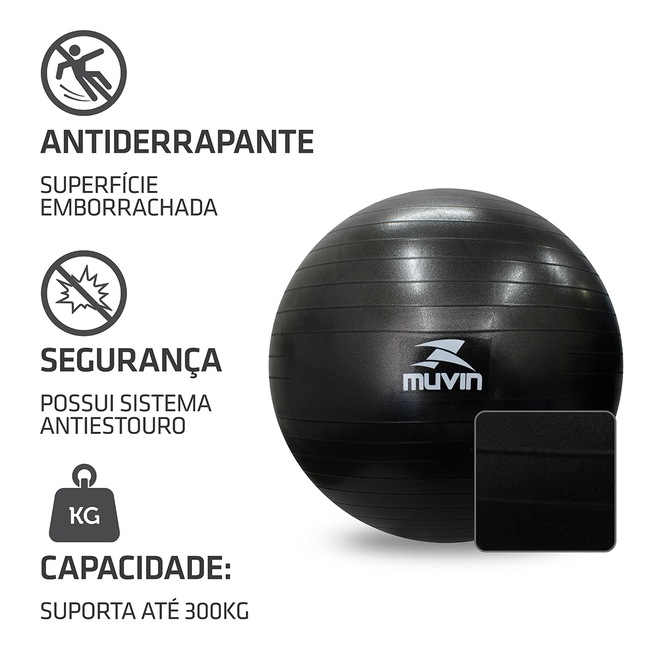 Por ter resistência e suportar até 300kg de peso estático, permite uma ampla utilização por qualquer pessoa. Esse fator também colabora para a melhor execução dos exercícios, pois garante a confiança no equipamento. Pensando na segurança, a Bola de Pilates possui função antiestouro, ou seja, se ela por algum motivo for perfurada, irá esvaziar lentamente e não estourar.