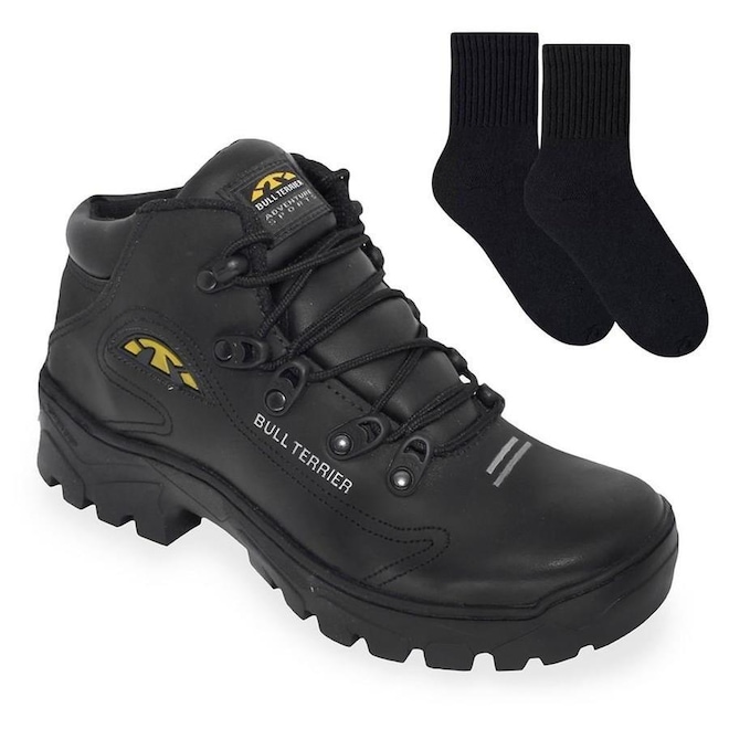 Sua jornada pelas trilhas e montanhas será elevada a um novo patamar com o Kit Bota Bull Terrier Masculina Bob Cat + Par de Meia! Cabedal em couro que garante qualidade, resistência, segurança e durabilidade. Fechamento por cadarço com reforço por ilhós para um ajuste perfeito. Seu interior forrado e acolchoado para proteção e conforto extra. A palmilha anatômica possui a Tecnologia Ortho Comfort que proporciona um conforto excepcional para seus pés, garantindo uma experiência única em cada passo. Desfrute de uma tração otimizada no solo, proporcionando maior segurança em todas as suas aventuras. Seja em trilhas desafiadoras ou terrenos irregulares, a tecnologia Power Grip está sempre pronta para o desafio. A Bota Bull Terrier Bob Cat é a escolha perfeita para quem busca aventuras com confiança e elegância. Esteja preparado para enfrentar qualquer terreno com o melhor em calçados para trilhas. Já as meias, por sua vez, são fabricadas a base de algodão e poliamida, fornecendo maior frescor e um toque suave aos pés. Possui cano médio, garantindo maior proteção, além de contar com sola atoalhada e costuras reforçadas, concedendo maior durabilidade a peça. O tamanho da meia pode variar de acordo com a numeração da bota.