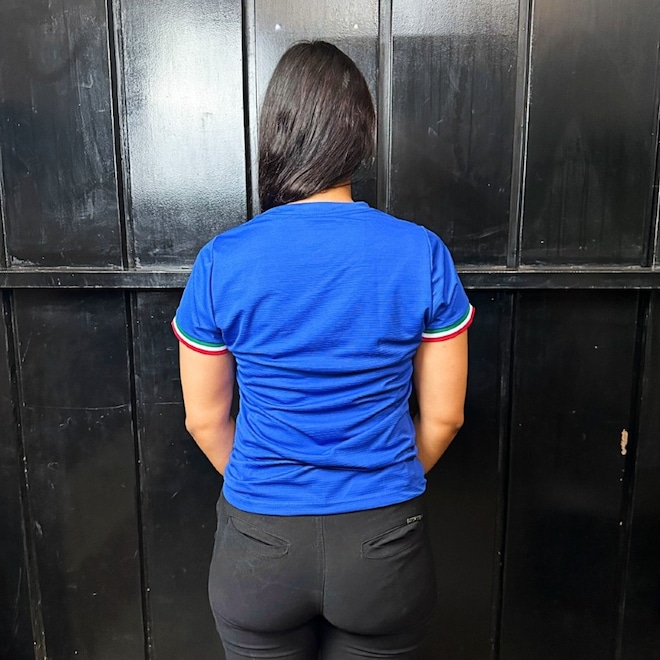 Produzida em 100% poliéster leve e respirável, a peça é azul com as estrelas do Cruzeiro em bordadas do lado esquerdo, detalhes em verde e vermelho no punho das mangas remetendo às cores da Itália.