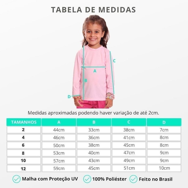 A camiseta proteção uv infantil da Dellas Fit é perfeita para sua pequena.Ela protege a pele durante a exposição solar, garantindo que a criança brinque por mais tempo, seja na praia, em casa, na escola ou em qualquer lugar!