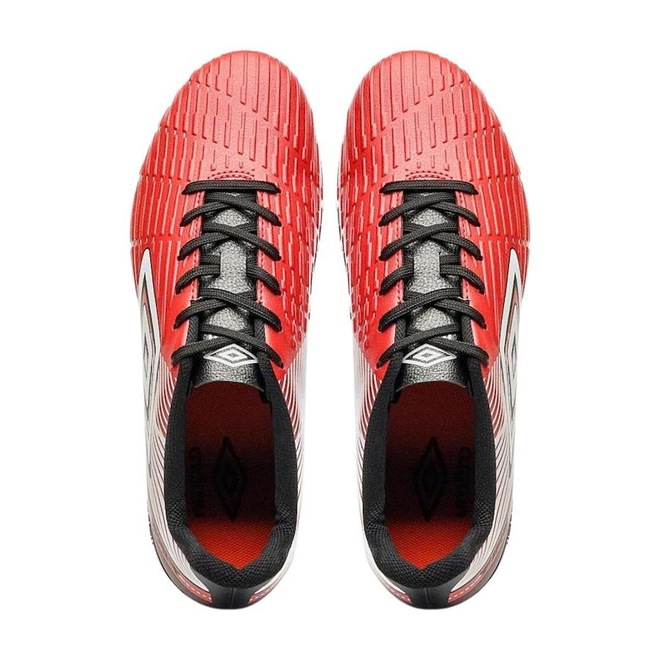 Indicada para jogadores iniciantes, a Chuteira para Campo Umbro Fire apresenta visual marcante com cores contrastantes e arte gráfica. O cabedal laminado tem textura frontal para melhor controle da bola, e o solado FG de 14 travas em PVC oferece durabilidade e aderência. Possui forro em poliéster e aplique de alta frequência. Marque aquele golaço com a chuteira Umbro Campo Fire!