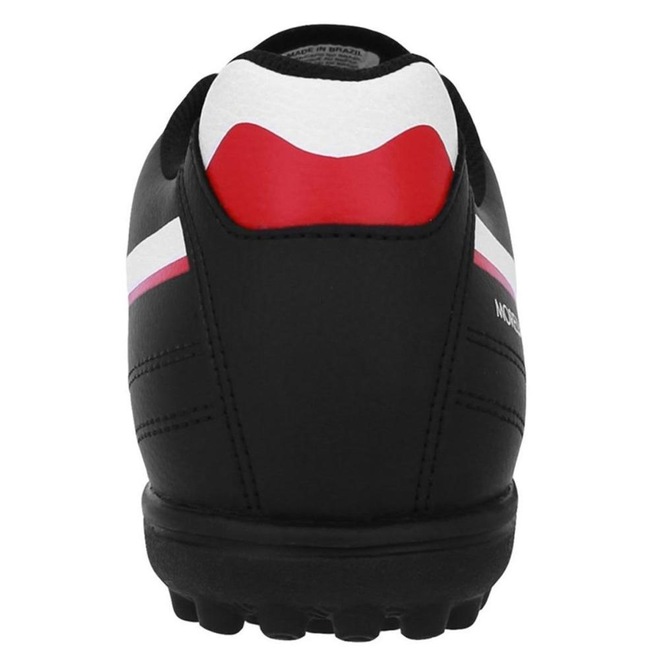 Cabedal: Material sintético com costuras resistentes e relevos que auxiliam no controle de bola.Solado: Borracha resistente com mini-cravos para gramados sintéticos.
