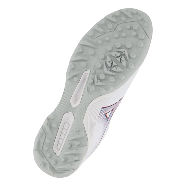 Já o solado de borracha possui travas fixas e pequenas para uma melhor aderência ao gramado.