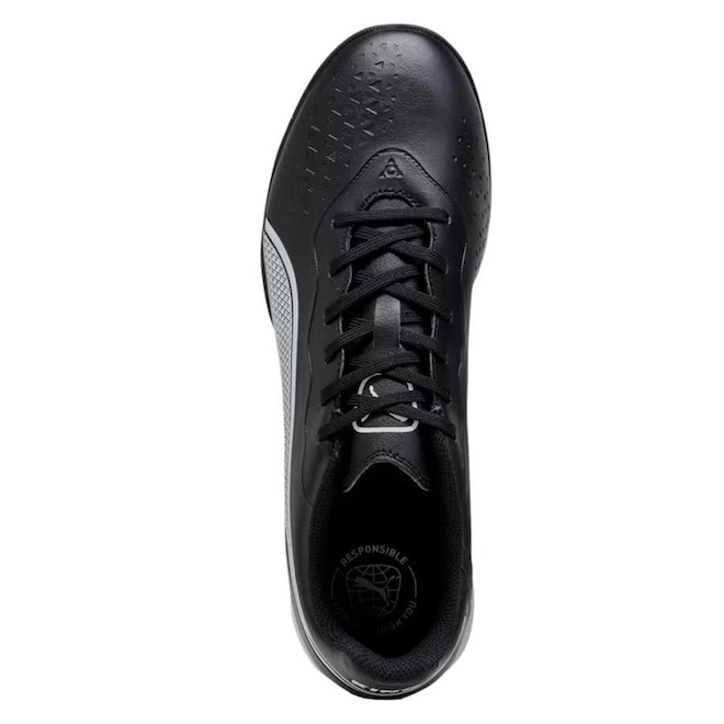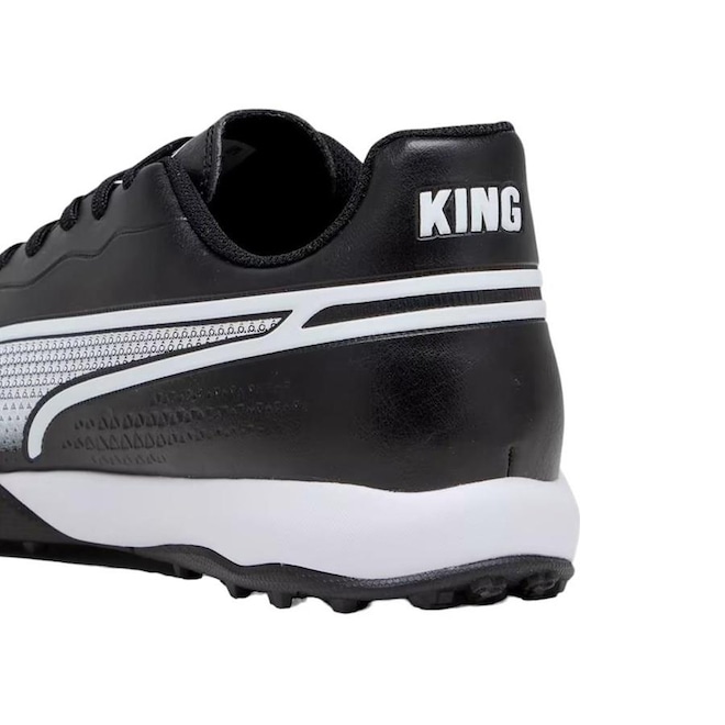 O kit Chuteira Society Puma King Match + Meião une conforto, sustentabilidade e desempenho para os amantes do futebol. O cabedal do calçado é macio, graças à sua microfibra feita de materiais recicláveis, proporcionando um toque suave e preciso na bola. Seu solado de borracha de perfil baixo é projetado para oferecer tração e estabilidade sem deixar marcas indesejadas no campo. Além disso, a entressola em EVA proporciona um amortecimento confortável. O modelo é ideal para uso em superfícies naturais duras ou grama artificial, tornando-a a escolha perfeita para partidas de futebol society. Referência: 107260.01. Complementando o kit temos o meião, ele é fabricado com um tecido especial de poliamida, poliéster e elastano, combinando leveza e conforto. Possui um design único, na cor preta, proporcionando maior versatilidade na hora de montar seus trajes esportivos. O tamanho do meião acompanha o tênis. Referência: 4171. Vista este kit e eleve o seu jogo!ref: M12EH6