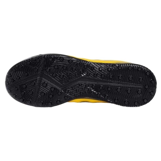 O solado da chuteira é de borracha equipado com micro travas estrategicamente posicionadas, que oferecem excelente tração e aderência em campos de grama sintética, permitindo movimentos rápidos e precisos.
