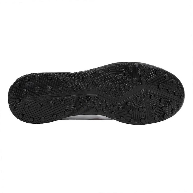 O solado da chuteira é de borracha equipado com micro travas estrategicamente posicionadas, que oferecem excelente tração e aderência em campos de grama sintética, permitindo movimentos rápidos e precisos.