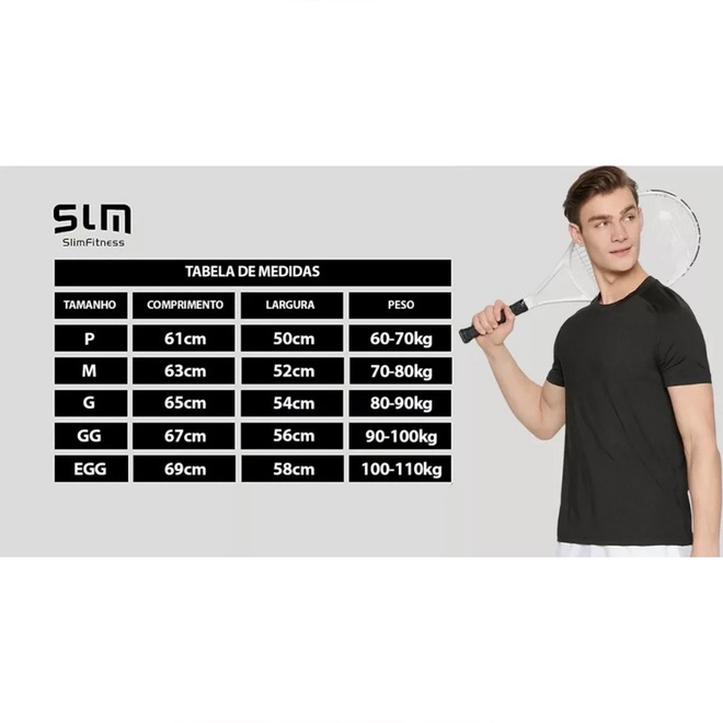 A camiseta da Slim Fitness é feita em tecido DryFit, leve e respirável, que mantem o corpo fresco, seco e confortável.