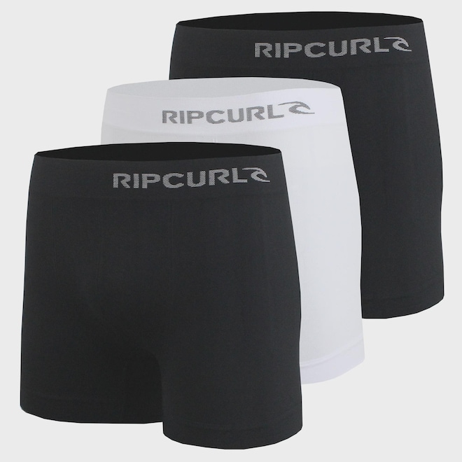 A Cueca Boxer Rip Curl Comfort Kit com 3 Black White sem costuras é produzida em tecido 95% Poliamida, 04% Elastano e 01% Poliprolpileno.