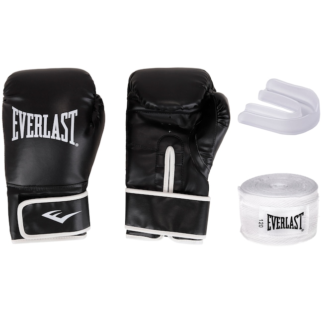 Indicado para aperfeiçoar os treinos, esse Kit de Boxe Everlast conta com um par de luvas de boxe, uma bandagem e um protetor bucal.