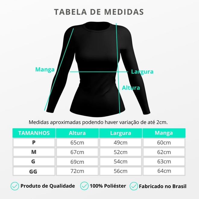 Tamanho P ? Altura: 65 cm, Largura 49 cm, Manga: 60 cm
