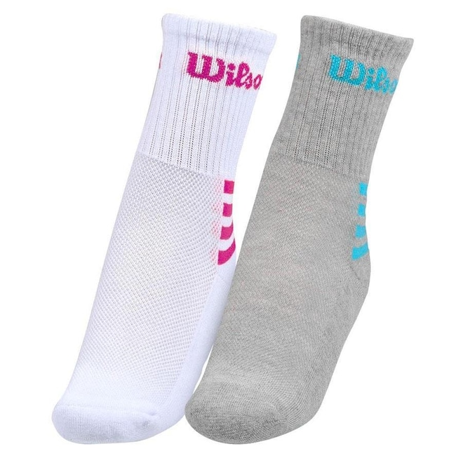 - Detalhamento: Pacote com 2 pares de meia, que oferece durabilidade, maciez e conforto, escrita Wilson na lateral do cano, quatro faixas coloridas próximo ao calcanhar, calça do tamanho 34 ao 38