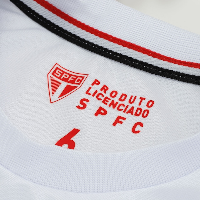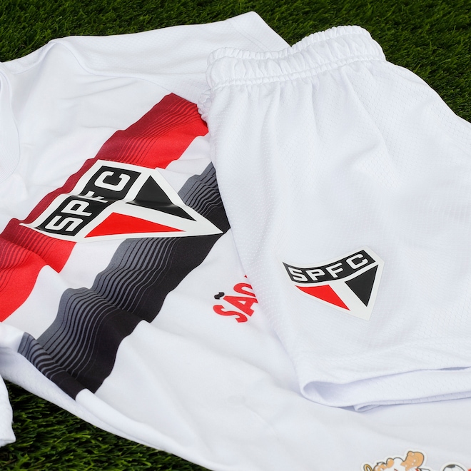Este uniforme infantil São Paulo, com estampa personalizada, é ideal para o dia a dia e para vibrar em cada jogo do SPFC.