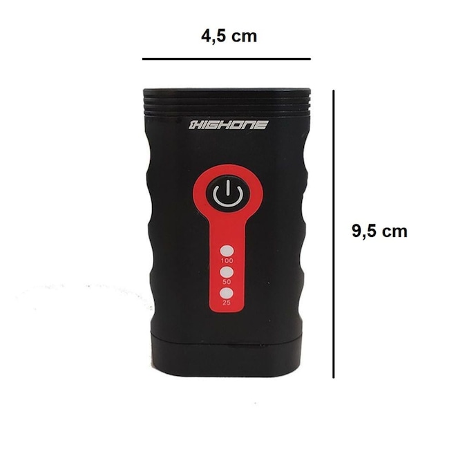 O farol para bike High One possui luz de led de 900 lumens de potência, com 3 modos de luz, indicador de carga da bateria e carregamento via USB.