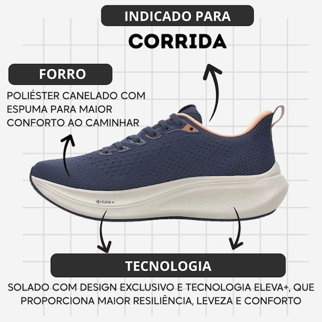 -ELEVA: A Eleva+ é uma tecnologia de EVA que oferece um efeito trampolim, absorvendo o impacto da passada e transformando-o em impulsão. É uma espuma macia que proporciona conforto e resposta para atividades diárias, como maratonas.