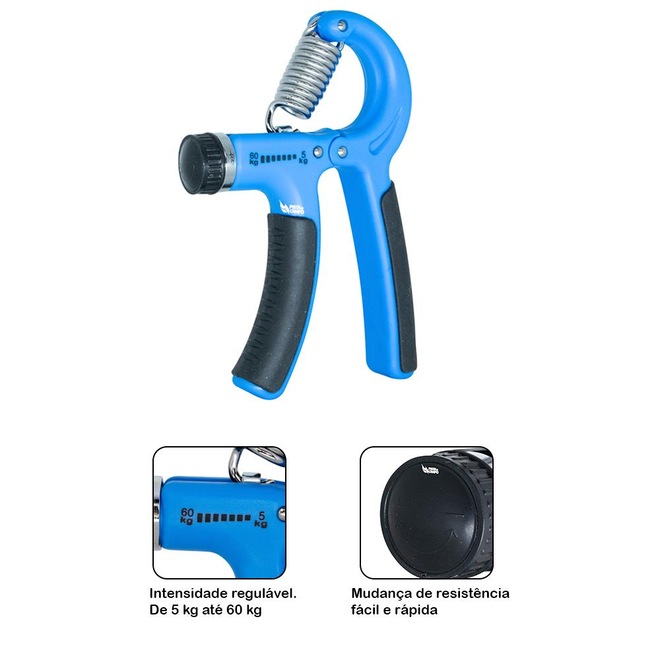 Contém 03 itens: 01 hand grip com molas exercitador de dedos, 01 hand grip com intensidade de 5 a 60kg e 01 anel hand grip de borracha com intensidade média.