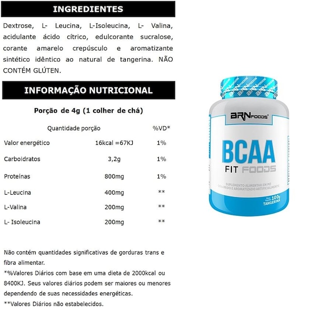 BCAA FIT FOODS é indicado para ser ingerido antes e após o treino, pois fornece energia e retarda a fadiga central. Estimula a síntese de proteína muscular recuperando imediatamente os músculos danificados e prevenindo dores. A suplementação com BCAA está entre as mais importantes para qualquer programa nutricional esportivo, pois eles são indispensáveis para a manutenção e crescimento dos músculos.