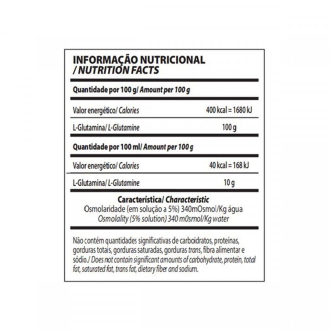 A suplementação de glutamina favorece o organismo na obtenção de um balanço nitrogenado positivo. BENEFÍCIOS : - Fortalece sistema imunológico - Promove melhora na permeabilidade e integridade intestinal - Auxilia a recuperação muscular - Diminui as chances de overtraining - Regula a síntese e degradação das proteínas - Remove o excesso de amônia e nitrogênio do corpo - Controla os processos de catabolismo e anabolismo MODO DE USO : Este produto foi elaborado para ser adicionado a alimentos, bebidas e dietas enterais.