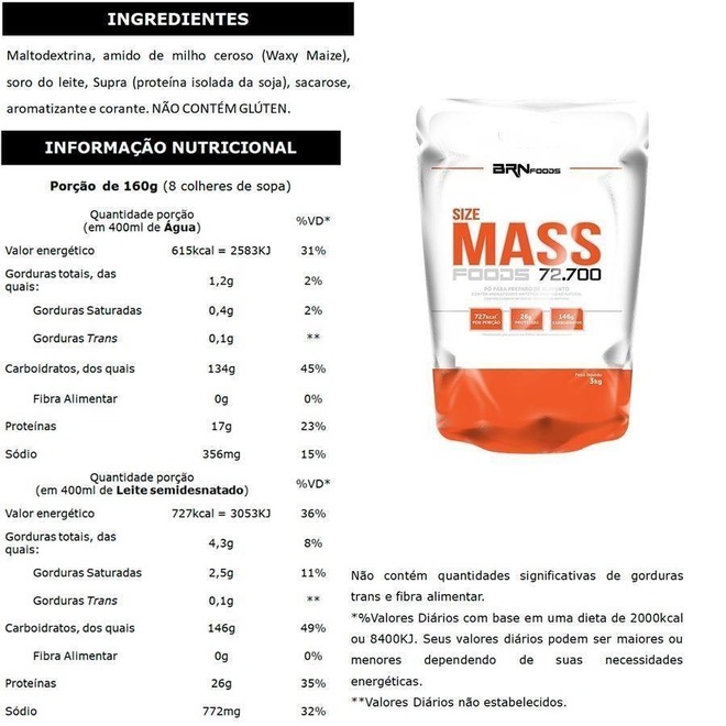 Hipercalórico Size Mass: Adicionar 160g (8 colheres de sopa cheia) em 250ml (1 1/4 copo) de leite semidesnatado.Consumir imediatamente após o preparo.