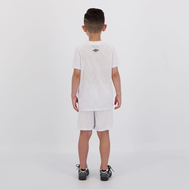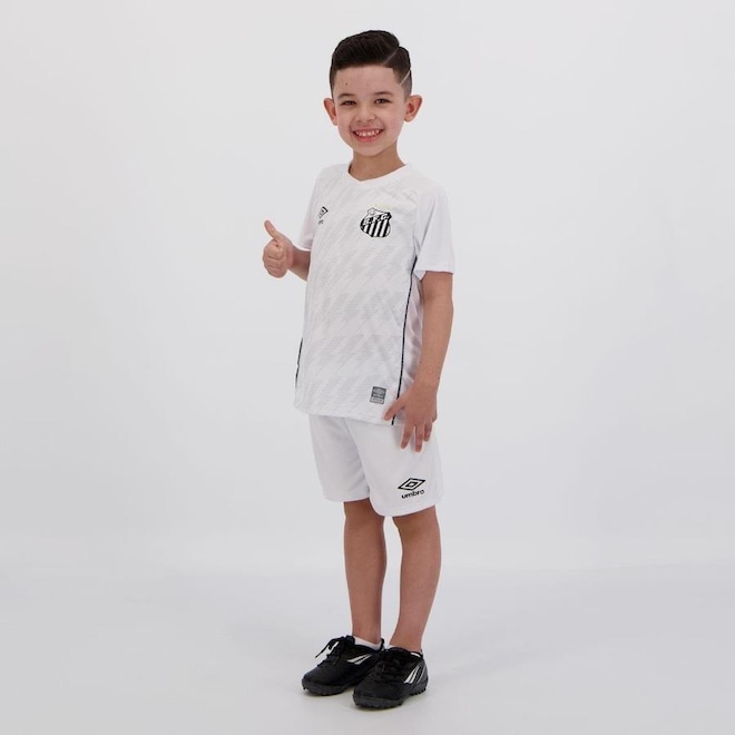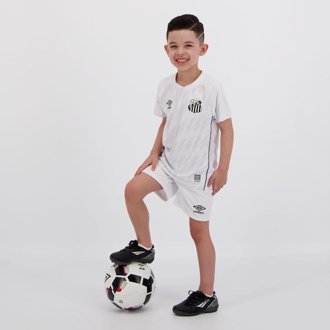 - Sobre o produto - Kit de Uniforme do Santos Umbro I 2021 - Infantil- Kit de Uniforme Santos Umbro I 2021 - Infantil - Para celebrar o 109° aniversário do Peixe, a Umbro apresenta para a temporada 2021 o kit infantil Santista. - A camisa traz o tema "Raios" que caem sempre no mesmo lugar, simbolizando a tradição do time em lançar craques ano após ano. - O conjunto apresenta dois selos exclusivos na parte interna: um é visto na região da gola com a frase ""Onde Nascem os Raios"" e outro aparece na barra com a descrição ""O Santos é o clube onde nascem os raios ""Meninos da Vila"" . - Ajuste calção: Elástico e cordão