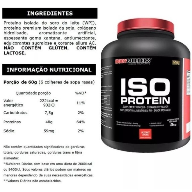 a) Iso Protein: Misture aproximadamente 60g ( 6 colheres de sopa rasa) em 350ml (1 3/4 copo ) de água gelada e agite por 20 segundos. Consumir imediatamente após o preparo.