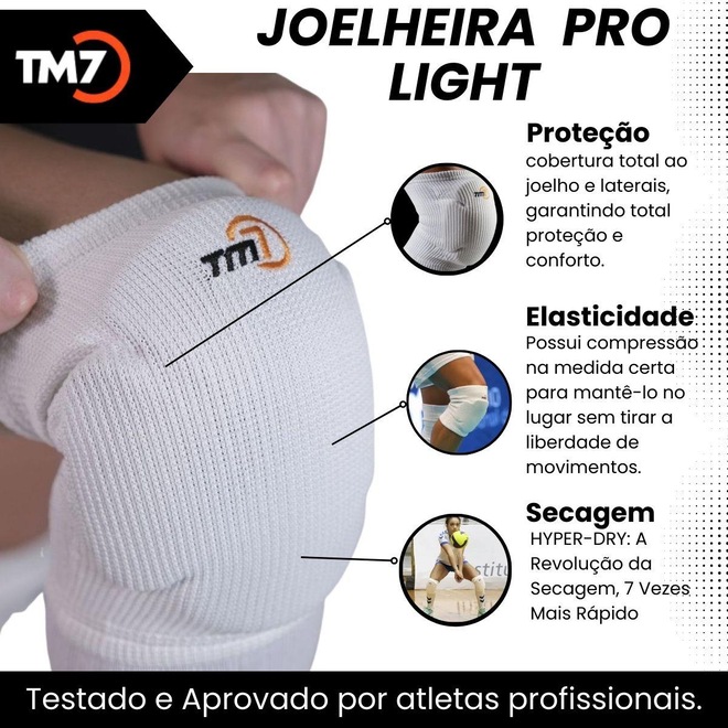 Joelheira TM7 Pro Light: Proteção total contra impactos, material que não absorve umidade e compressão perfeita para conforto e segurança.