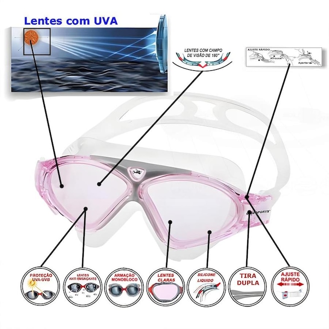 O Kit Máscara de Natação Gold Sports Silicone Confort HD - Touca Pu e Protetor nasal e ouvido são projetados para atender às necessidades dos nadadores que desejam muito conforto , com uma tecnologia anti- embaçante inovadora que garante uma visão clara, mesmo nas condições mais desafiadoras. Equipado com lentes de angular, anti-fog e de alta definição, Mergulhe em águas cristalinas e com a tecnologia de ultima geração de suas lentes proporcionam uma experiência subaquática nítida e indescritível. A Máscara de Natação Gold Sports Silicone liquido Confort High Definition é fabricada com um material de silicone liquido e durável, que se encaixa confortável ao or dos olhos sem causar irritação ou desconforto, permitindo que você nade por horas, não deixando sua cavidade ocular marcada. Sua armação e tira em silicone liquido de ultima geração ultra confortável e capaz de se adaptar a qualquer formato de rosto. Pode ser facilmente ajustado.A máscara de Natação Gold Sports Silicone Confort High Definition apresentam um design elegante e moderno são perfeitos para uma variedade de atividades aquáticas, incluindo natação, mergulho e muito mais. Se você é um iniciante ou um profissional experiente, nossa Máscara de Natação Gold Sports Silicone liquido Confort High Definition suas lentes são transparente muito são confeccionadas em policarbonato de ultima geração proporcionando uma visão HD, possuim duas camadas anti-fog, proteção UVA e UVB400 e formato curvadas proporcionando uma visão angular de 180°. Suas tiras em silicone liquido ultra soft com ajuste rápido facilida o ajuste de sucção no seu rosto. Possui touca em PU (tecido revestido em poliuretano) deixando seu cabelos bem protegidos contra ação do cloro e super confortável, protetor de ouvido em silicone e polipropileno e protetor de ouvido de silicone ultra confort super macio e com um vedação