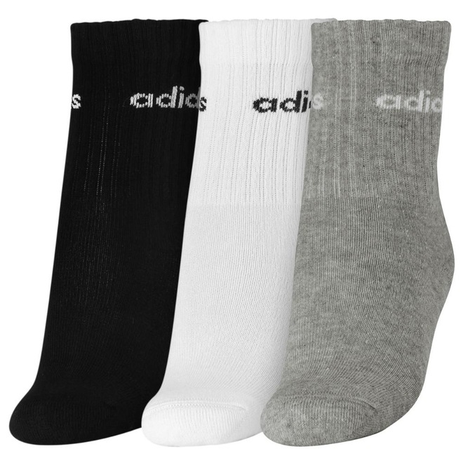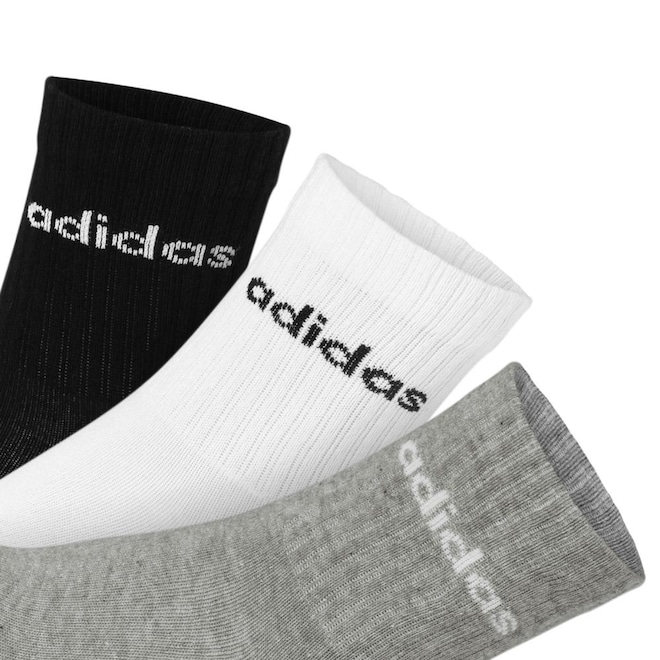 - Detalhamento: Pack com 3 pares de meias nas cores branca, preta e cinza. Cano médio de aproximadamente 9cm com escrita adidas. Tecido macio e confortável;
