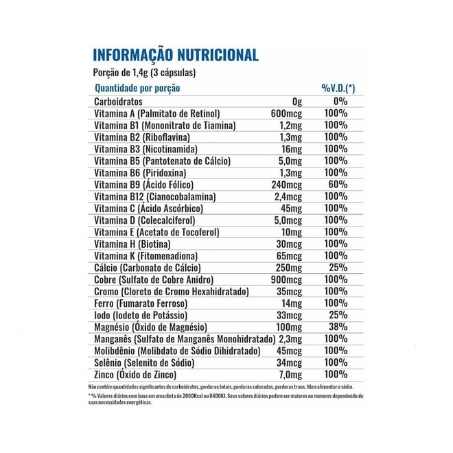 Os benefícios ajudam com a prática de atividades físicas, garantindo que você tenha sempre em mãos os melhores nutrientes para a recuperação pós-treino e a disposição de treinar cada vez melhor.DISPONÍVEL EMPotes de 90 cápsulasINFORMAÇÃO NUTRICIONALPorção de 1,4 g (3 Cápsulas)Quantidade por porção %V.D.(*)Carboidratos 0 g 0%Vitamina A (Palmitato de Retinol) 600 mcg 100%Vitamina B1 (Mononitrato de Tiamina) 1,2 mg 100%Vitamina B2 (Riboflavina) 1,3 mg 100%Vitamina B3 (Nicotinamida) 16 mg 100%Vitamina B5 (Pantotenato de Cálcio) 5,0 mg 100%Vitamina B6 (Piridoxina) 1,3 mg 100%Vitamina B9 (Ácido Fólico) 240 mcg 60%Vitamina B12 (Cianocobalamina) 2,4 mcg 100%Vitamina C (Ácido Ascórbico) 45 mg 100%Vitamina D (Colecalciferol) 5,0 mcg 100%Vitamina E (Acetato de Tocoferol) 10 mg 100%Vitamina H (Biotina) 30 mcg 100%Vitamina K (Fitomenadiona) 65 mcg 100%Cálcio (Carbonato de Cálcio) 250 mg 25%Cobre (Sulfato de Cobre Anidro) 900 mcg 100%Cromo (Cloreto de Cromo Hexahidratado) 35 mcg 100%Ferro (Fumarato Ferroso) 14 mg 100%Iodo (Iodeto de Potássio) 33 mcg 25%Magnésio (Óxido de Magnésio) 100 mg 38%Manganês (Sulfato de Manganês Monohidratado) 2,3 mg 100%Molibdênio (Molibdato de Sódio Dihidratado) 45 mcg 100%Selênio (Selenito de Sódio) 34 mcg 100%Zinco (Óxido de Zinco) 7,0 mg 100%Não contém quantidades significativas de proteínas, gorduras totais, gorduras saturadas, gorduras trans, fibra alimentar e sódio.*% Valores Diários de Referência com base em uma dieta de 2000 kcal ou 8400 kJ.Seus alores diários podem ser maiores ou menores dependendo de suas necessidades energéticas.