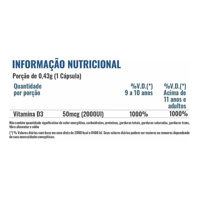 Vitamina D3 2000UI a vitamina D auxilia na formação de ossos e dentes, na absorção de cálcio e fósforo, no funcionamento do sistema imune, no funcionamento muscular, na manutenção de níveis de cálcio no sangue e no processo de divisão celular.