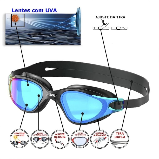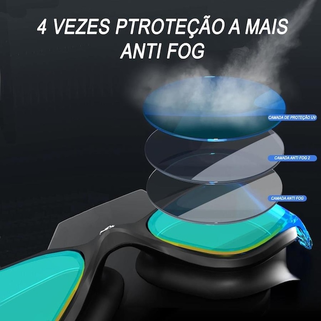 * Possui um frame com gasckets projetado em design 3D impedindo a entrada de água e se adequa a qualquer rosto. Perfeito para natação.