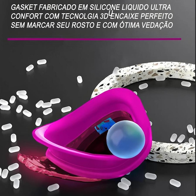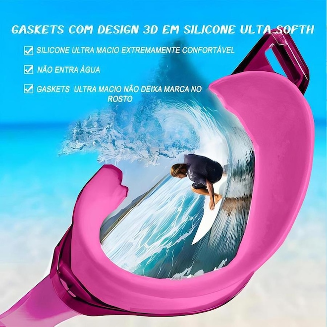 * Possui um frame com gasckets projetado em design 3D impedindo a entrada de água e se adequa a qualquer rosto. Perfeito para natação.