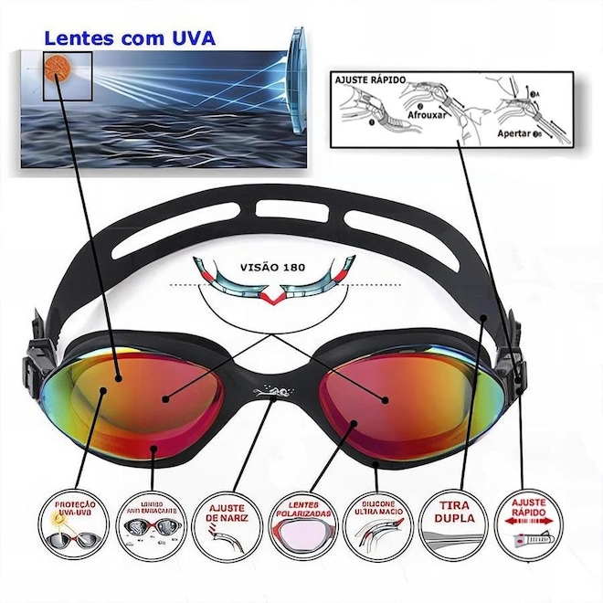 O Kit Oculos De Natação Gold Sports Wave Performance Espelhado Touca de Elastano Nose Clip e Ear Plug são projetados para atender às necessidades dos nadadores profissionais, com uma tecnologia anti-fog inovadora que garante uma visão clara, mesmo nas condições mais desafiadoras. Equipado com lentes de grande angular permitindo uma visão de 180/, anti-fog e de alta definição HD espelhadas: Mergulhe em águas cristalinas com a ajuda de nossa grande angular, anti-fog, e lentes de alta definição que proporcionam uma experiência subaquática nítida e imersiva. Ajuste confortável: O óculos de natação foi criado com um material de silicone macio e durável que se encaixa confortavelmente ao redor dos olhos sem causar irritação ou desconforto tudo pelo seu frame ser 3D, permitindo que você nade por horas. Possui armação monobloco que facilita o melhor encaixe a qualquer rosto, permitindo uma vedação adequada não irritando a pele e impedindo a entrada de água, o óculos de natação apresentam um design elegante e moderno  O óculos de natação é perfeitos para uma variedade de atividades aquáticas, incluindo natação, mergulho, Triatlon e muito mais. Suas lentes são em policarbonato de ultima geração com duas camadas anti-fog e espelhadas com proteção UVA e UVB400, tiras duplas em silicone ultra soft com ajuste rápido. A touca e confeccionada em tecido 100% elastano com constura de ultima geração trançada. O clip nasal e resistente e possui silicone ultra macio não deforma é muito confortável e resistênte. O protetor de ouvido e em formado de abelha com silicone ultra maçio anti alérgico, e tem um design arrojado impedindo a entrada de água no ouvido.