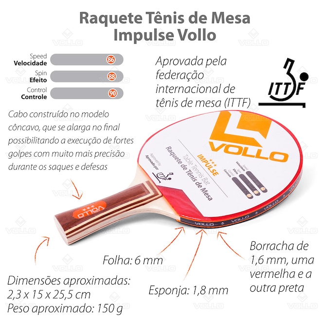A Raquete Impulse Vollo foi eleita a melhor do mercado, aprovada pela ITTF. Possui equilíbrio ideal entre velocidade, controle e efeito. Seu cabo anatômico garante pegada firme e confortável, permitindo jogadas rápidas e precisas.