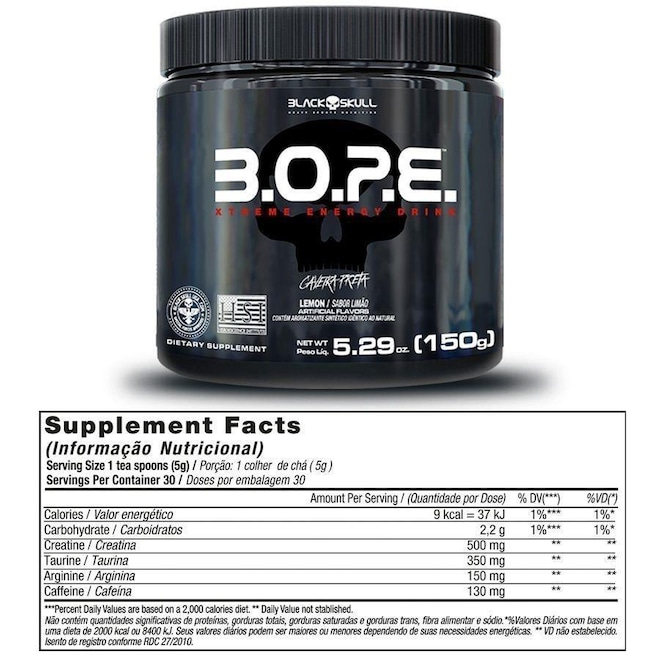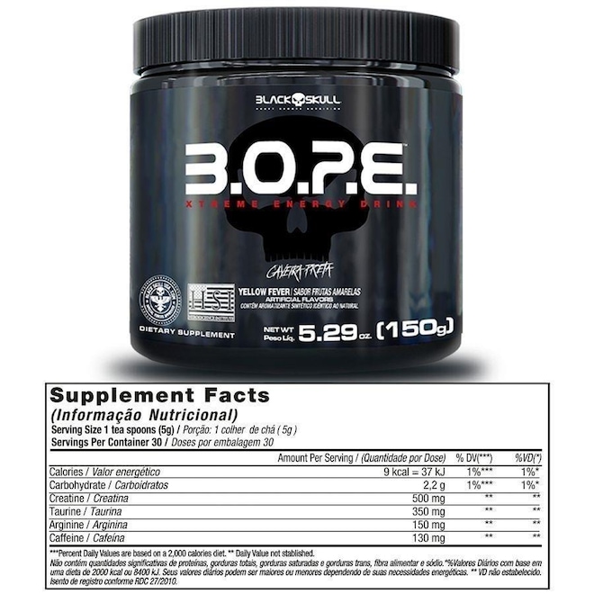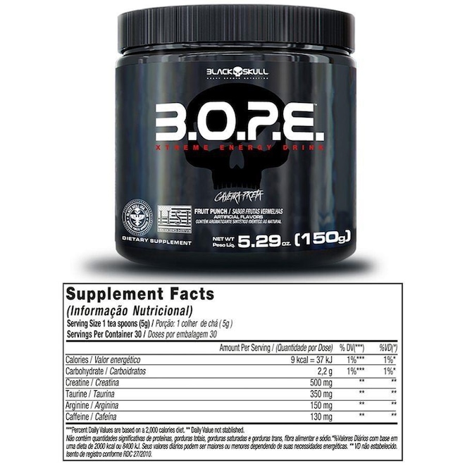 E® faz parte da linha Caveira Series® da Black Skull USA? possui em sua fórmula ingredientes como a Creatina, que tem como função aumentar a força e o desenvolvimento muscular, Taurina atua no organismo gerando mais energia, Arginina melhora a vasodilatação e a Cafeína, que além de ser um ótimo estimulante, gerando mais energia, foco e concentração durante o treino, selecionados para proporcionar mais energia e disposição durante seu treino, garantindo os resultados mais esperados como um SOLDADO CAVEIRA!