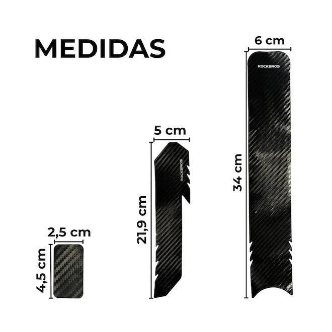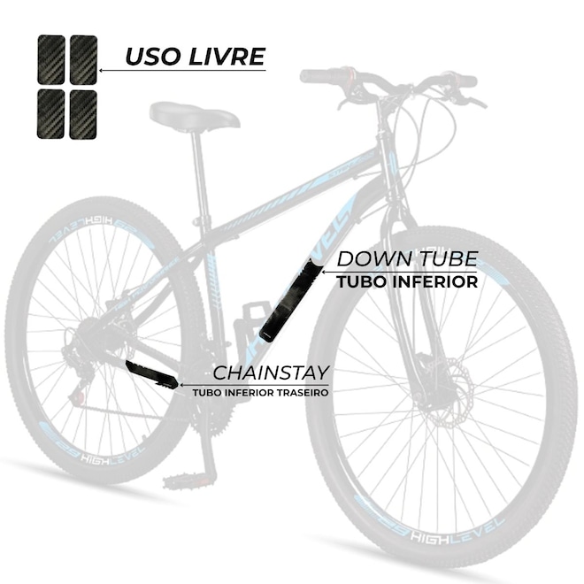 - Contém: 1 protetor down tube (parte inferior do quadro), 1 protetor chainstay (protetor de corrente) e 4 protetores de uso geral