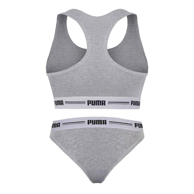 Exercite-se com mais desempenho e aumente seu estilo esportivo com o Kit Puma Top + Calcinha Biquini Cotton Feminino. O top é confeccionado em algodão, poliéster e elastano, o que permite que você obtenha sensação suave, leveza e elasticidade durante seus exercícios. As costas no estilo nadador oferecem mais frescor e mais liberdade para seus movimentos. A barra elástica se ajusta ao seu corpo, oferecendo mais segurança. Não possui bojo. Perfeita para adicionar conforto ao seu uso diário, a Calcinha Puma Biquíni ainda oferece muito estilo. Confeccionada em algodão, poliéster e elastano, a peça propicia sensação de maciez e elasticidade. Sua modelagem biquíni e o cós elástico permitem melhor ajuste ao corpo. Conta com fundo também em algodão. Medidas aproximadas do Top (cm): P: 28x26 / M: 30x28 / G: 32x30 / EG: 34x32 (Largura x Comprimento). Medidas aproximadas da calcinha (cm): P: 36x20,5 / M: 38x22,5 / G: 40x24,5 / EG: 42x26,5 (Largura x Comprimento).