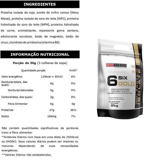 Composição do Kit: 1x 100% WHEY PROTEIN ISOLADO - 6 Six Gold: Refil de 2Kg 1x BCAA 4,5: pote com 100g 1x CREATINA: pote com 100g 1x Coqueteleira: 600ml 100% PROTEIN ISOLATE 6 SIX GOLD aliando alta qualidade com um delicioso sabor, o Whey Protein Isolado Six Gold é ideal para atletas que buscam ganho de massa muscular.