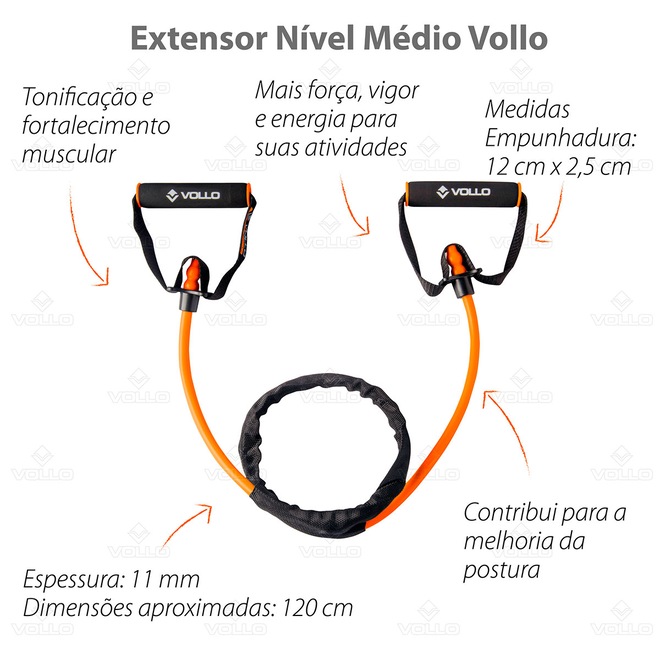 - Sobre o produto - Kit Super Band Leve + 3 Mini Bands + Extensor Médio Vollo - Práticas, resistentes e confortáveis, as faixas elásticas e extensores Vollo foram desenvolvidos para potencializar seus treinos e garantir resultados seja em casa, na academia ou em qualquer lugar. - As Faixas Elásticas Mini Bands Vollo, é o acessório perfeito para quem busca resultados reais, mais força e flexibilidade em qualquer lugar. Práticas, leves e extremamente versáteis, as faixas elásticas permitem uma ampla variedade de exercícios para todos os níveis, do iniciante ao avançado. - A Super Band Nível Leve Vollo, também conhecida como training bands ou bandas elásticas, é utilizada em exercícios de fortalecimento, resistência muscular, tonificação corporal, mobilidade e flexibilidade. Com a super band da Vollo você garante um acessório que possibilita trabalhar o corpo todo, além de proporcionar realizar diversos tipos de exercícios, sejam eles durante treinos funcionais, pilates, musculação ou fisioterapia. O elástico extensor se adapta a sua modalidade preferida! - Já o Extensor Elástico Nível Médio Vollo potencializa a força e estabilidade corporal, permitindo uma ampla variedade de exercícios. Com ele, você ativa grupos musculares completos, melhora o alinhamento postural, coordenação motora e mobilidade articular, garantindo treinos mais completos e eficazes. - Descubra a combinação ideal entre força, conforto e resultado. Garanta já o seu Kit Vollo e transforme seu treino em um novo desafio a cada repetição! - Principais Benefícios Kit Extensores - • Tonificação e fortalecimento muscular - • Potencializa e melhora o condicionamento físico - • Mais força, vigor e energia para suas atividades - • Contribui para a melhoria da postura - • Músculos e articulações mais fortes e resistentes - • Maior mobilidade, flexibilidade e coordenação motora - • Alongamentos e fortalecimento muscular - Especificações Kit - Super Band Leve - • Dimensões aproximadas: 208 x 2,1 x 0,45 cm - • Cinza claro Nível leve 21mm (espessura) - • Peso aproximado: 194g - • Força de tração aproximada: 11,5 - 29,5 kg - • Composição: Latex - Kit 3 Faixas Mini Bands - • Dimensões aproximadas: 25cm (C) x 3cm (A) - • Cinza claro: Nível leve 0,60mm (espessura) - • Laranja: Nível médio 0,80mm (espessura) - • Cinza escuro: Nível forte 1,00mm (espessura) - • Composição: Borracha Termoplástica (TPE) - Extensor Nível Médio - • Cor: Laranja (nível médio) - • Peso aproximado: 145 g - • Espessura: 11 mm - • Dimensões aproximadas: 120 cm - • Dimensões aproximadas empunhadura: 12cm x 2,5cm - • Composição: Termoplástico e Polipropileno (PP) - ref: M17VS8