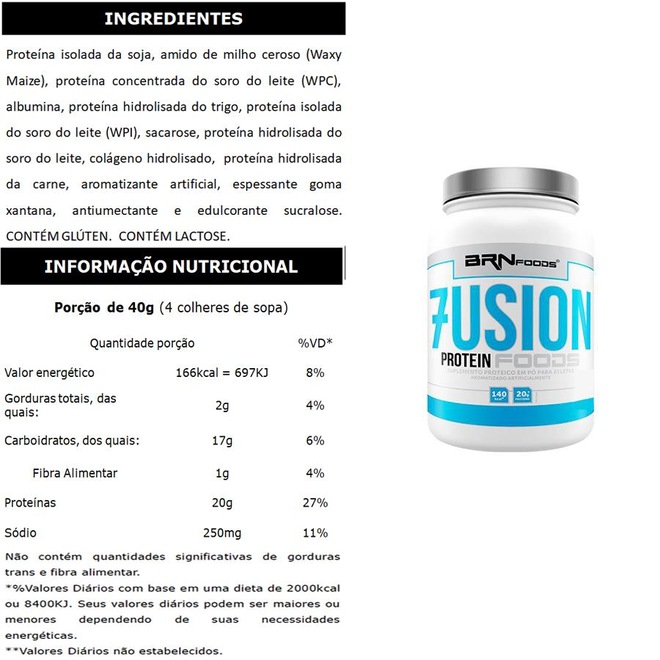 Composição do Kit: 4x WHEY PROTEIN FUSION: Pote com 900g WHEY PROTEIN FUSION é elaborado para atender uma variedade de dietas e estilos de vida, é composta por 7 PROTEÍNAS combinadas, cada uma com diferentes perfis de aminoácidos. Sua fórmula garante absorção da proteína por um tempo prolongado e é a solução ideal para as necessidades de proteína de qualquer indivíduo. É uma boa opção para quem quer aumentar a quantidade de SUGESTÃO DE CONSUMO: Misture 40g (4 colheres de sopa rasas) em 300ml de água, ingerir de 1 a 4 vezes ao dia ou conforme orientação profissional. IMPORTANTE: a) Validade dos produtos: de 18 a 24 meses b) Vendemos somente produtos originais e devidamente lacrados