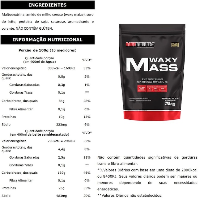 COMPOSIÇÃO DO KIT: 1x Waxy Whey Protein: Pote com 900g 1x Hipercalórico Waxy Mass: Refil com 3kg 1x BCAA: pote com 100g 1x Creatina: pote com 100g 1x coqueteleira 600ml WAXY MASS é indicado para pessoas que têm o metabolismo muito acelerado e querem ganhar peso desenvolvendo massa magra. O hipercalórico WAXY MASS foi desenvolvido com os melhores carboidratos de rápida absorção em conjunto com as proteínas do soro do leite e da soja, fornecendo a cada dose se consumido com leite semidesnatado 727kcal e 26g de proteínas. WAXY WHEY possui em sua formulação a proteína concentrada do soro do leite (WPC), uma proteína de alto valor biológico, rica em BCAAs (aminoácidos de cadeia ramificada). A suplementação de proteína potencializa, na maioria das vezes, o aumento e a força dos feixes musculares quando associada a um programa de exercícios físicos, demonstrado por artigos científicos. BCAA 4.5 é um suplemento alimentar composto pelos 3 aminoácidos essenciais de cadeia ramificada, L-Leucina, L-Isoleucina e L-Valina. Auxilia na diminuição das dores musculares e fadiga, gerando assim maior energia e força para execução dos exercícios. CREATINA é usada pelo tecido muscular para a produção de fosfocreatina, fator importante na formação de adenosina trifosfato (ATP), que funciona como um repositor de energia. COQUETELEIRA fabricada em material plástico resistente. A cor varia de acordo com a disponibilidade em estoque. SUGESTÃO DE CONSUMO: a) Hipercalórico Waxy Mass: Adicionar 160g (8 colheres de sopa cheia) em 250ml (1 ¹/4 copo) de leite semidesnatado. Ingerir 2 porções diárias ou conforme orientação de médico e/ou nutricionista. b) Waxy Whey Protein: Adicionar 50g (5 colheres de sopa rasa) em 350mL (1 3/4 copo) de água gelada. Bater em liquidificador ou coqueteleira e consumir imediatamente após o preparo. c) Bcaa: Sugere-se 1 porção de 5g (1 colher de chá) diluída em 200ml (1 copo) de água. d) Creatina: Dissolver 6g (2 colheres de café) em 100ml (1/2 copo) de água. IMPORTANTE: a) Validade dos produtos: de 18 a 24 meses b) Vendemos somente produtos originais e devidamente lacradosref: M03C1Q