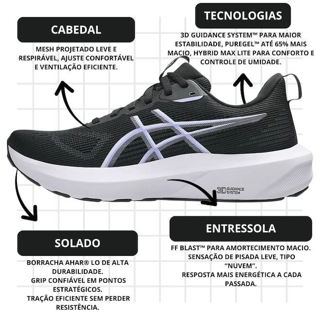 - FF BLAST™: Proporciona uma sensação de pisar nas nuvens com resposta mais ágil e eficiente.