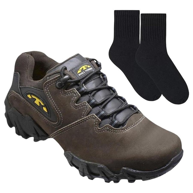 Apresentando o Kit Tênis Bull Terrier Bruce + Par de Meia, o seu companheiro para explorar novos horizontes com total conforto! Projetada para proporcionar um conforto excepcional enquanto você enfrenta novos desafios, essa bota oferece ótimo amortecimento, tração e aderência, mantendo seus pés seguros em cada passo. Com detalhes refletivos para segurança adicional, é a escolha ideal para praticantes de esportes radicais que buscam conforto e proteção. O cabedal em couro proporciona durabilidade e resistência, atendendo às demandas dos apaixonados por aventura. Para garantir o máximo conforto, a Bull Terrier desenvolveu uma palmilha anatômica com a tecnologia Ortho Comfort, pensando no bem-estar dos seus pés durante cada movimento. Além disso, o solado de borracha apresenta o sistema Power Grip, oferecendo agarre e aderência superiores em uma ampla variedade de terrenos, proporcionando estabilidade em suas explorações. Já as meias, por sua vez, são fabricadas a base de algodão e poliamida, fornecendo maior frescor e um toque suave aos pés. Possui cano médio, garantindo maior proteção, além de contar com sola atoalhada e costuras reforçadas, concedendo maior durabilidade a peça. O tamanho da meia pode variar de acordo com a numeração do tênis.ref: M12JZO