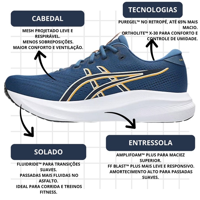 AMPLIFOAM™ PLUS: Ajuda a melhorar a durabilidade cria uma sensação mais suave e confortável ao pisar.
