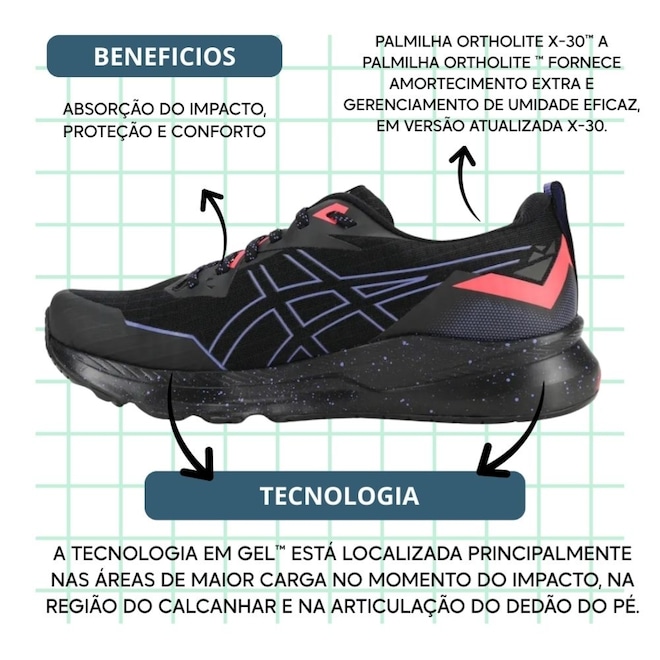 - GEL: absorção de impacto, proteção e conforto, reduzindo a fadiga muscular.