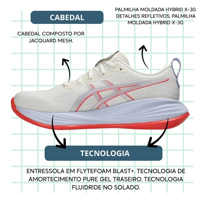 - Gel: absorção de impacto em áreas estratégicas, reduzindo a fadiga durante a corrida.