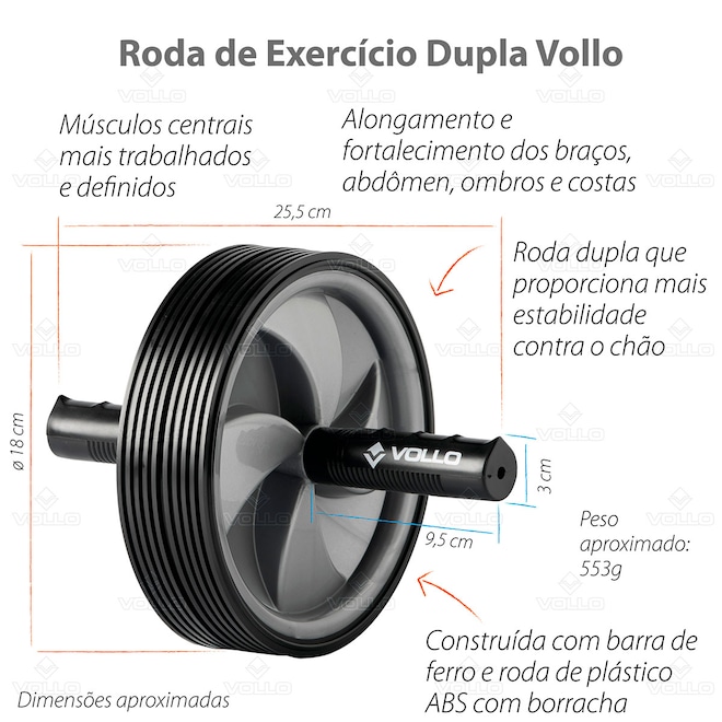 Já a Roda de Exercício Dupla Vollo foi projetada com alta tecnologia para proporcionar treinos intensos e seguros, ativando músculos do core, ombros, braços e até pernas, garantindo estabilidade, força e condicionamento.